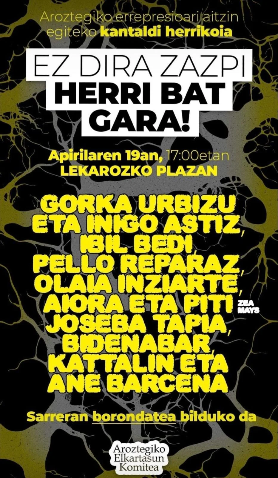 Aroztegiko auziperatuekin elkartasunez, kantaldia antolatu dute Lekarozen apirilaren 19an. “Ez gara 7, herri bat gara” lema erabili dute joan den urtean auziperatu ziztuenen sustengu kanpaina eramateko. Aurreikusiak diren isunak pagatzeko, diru kanpaina bururatu dute, igandeko festarekin. Baina borroka ez da bukatu, akusazioak helegitea aurkeztu baitu Espainiako Auzitegi Gorenean. Zazpi auziperatuen artean den Aintzane Ariztegi izan dugu Zebrabidean.